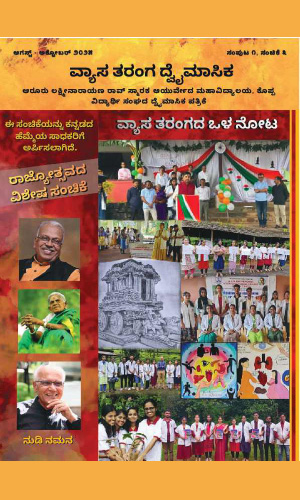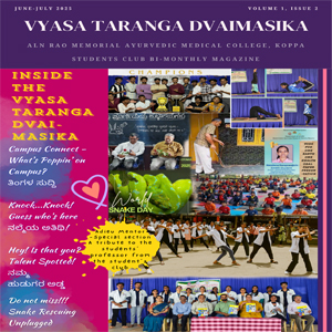 Vyasa Taranga is the official Students’ Club bi-monthly magazine of A.L.N. Rao Memorial Ayurvedic Medical College, launched in April 2025. It serves as a vibrant reflection of campus life, creative expression, and academic engagement — celebrating both Ayurvedic tradition and youthful innovation. Initiated under the aegis of the Aroor Educational Trust (R.), guided by Smt. Aroor Namitha Rao (Managing Trustee), Vyasa Taranga was envisioned as a common platform to bring together art, literature, and expression among students. It unites the Students’ Art & Literature Club and Press Club under one dynamic forum, drawing inspiration from Maharshi Vyasa. VYASATARANGA is the eternal symbol of knowledge, art, and authorship. The magazine was conceptualized and meticulously coordinated by Dr. Pooja Huilgol, who guided its first two editions before concluding her tenure at the institution.