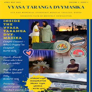 Vyasa Taranga is the official Students’ Club bi-monthly magazine of A.L.N. Rao Memorial Ayurvedic Medical College, launched in April 2025. It serves as a vibrant reflection of campus life, creative expression, and academic engagement — celebrating both Ayurvedic tradition and youthful innovation. Initiated under the aegis of the Aroor Educational Trust (R.), guided by Smt. Aroor Namitha Rao (Managing Trustee), Vyasa Taranga was envisioned as a common platform to bring together art, literature, and expression among students. It unites the Students’ Art & Literature Club and Press Club under one dynamic forum, drawing inspiration from Maharshi Vyasa. VYASATARANGA is the eternal symbol of knowledge, art, and authorship. The magazine was conceptualized and meticulously coordinated by Dr. Pooja Huilgol, who guided its first two editions before concluding her tenure at the institution.